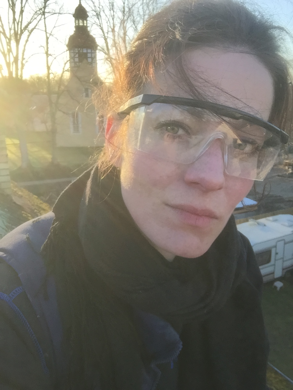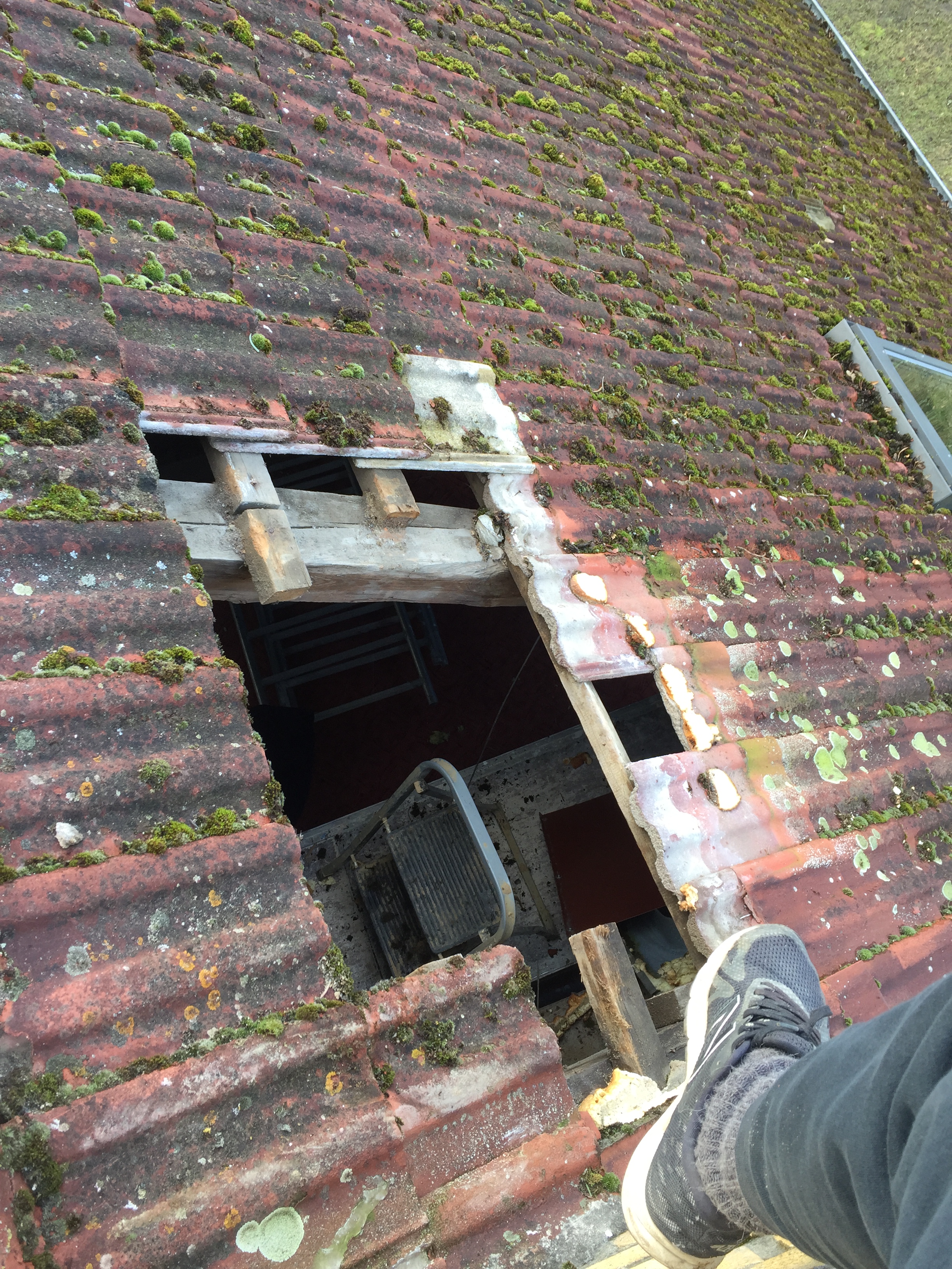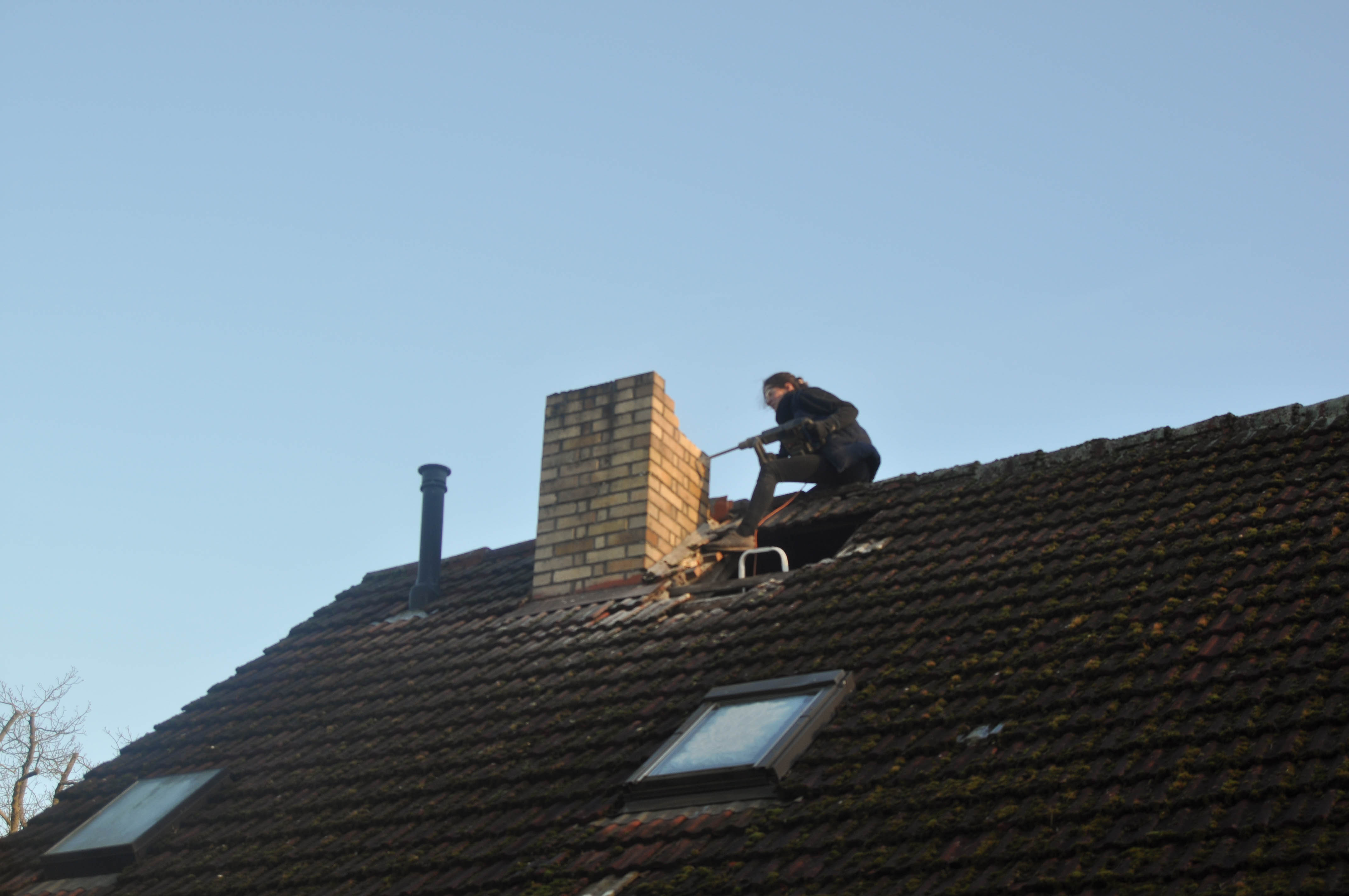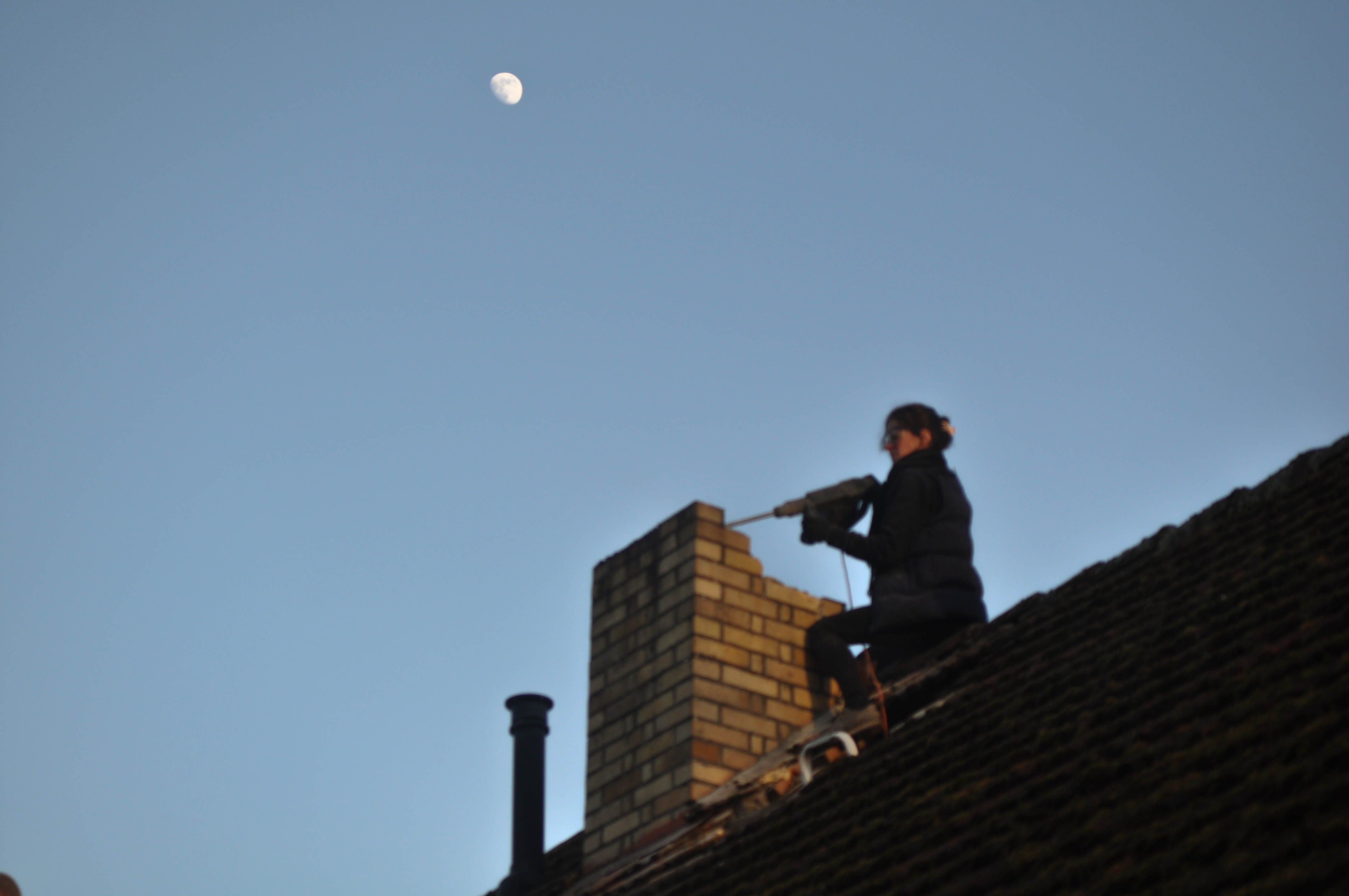 ob ich Angst hab wenn ich da oben am Schornsteinkopf rumoperiere…??? nee aber ich hatte schon einen kurzen Herzstillstand, Endzeitfantasien und hab mir doll in die Hosen gemacht als ein Dachstein auf den guten roten Teppich gefallen ist…!!!